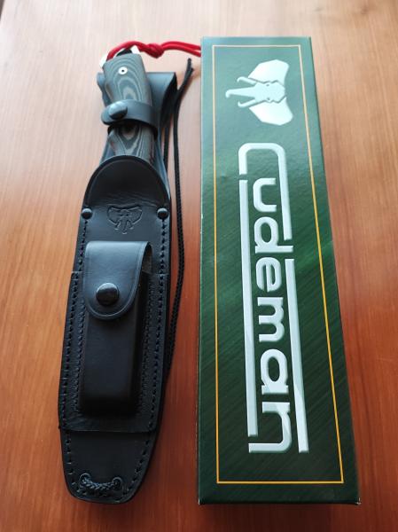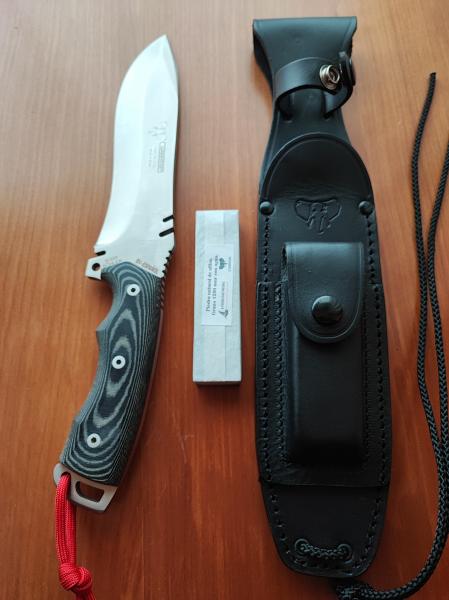 Hoja estilo "drop point", acero Böhler N695, la mejor y más robusta versión. Empuñadura de micarta negra, funda de piel ajustable al cinturón, piedra de afilar sin abrir, todo nuevo, con su caja original. Sin uso, a estrenar.