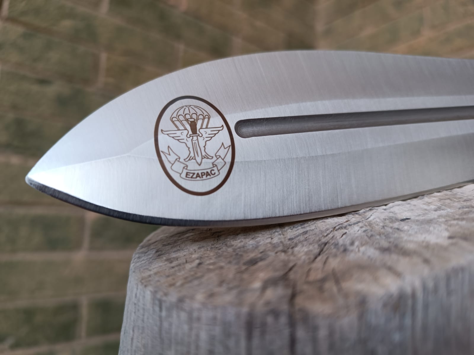 Reproducción o versión del cuchillo machete utilizado por las fuerzas armadas del ejercito del aire español por la brigada de la Ezapac. Hoja de acero inoxidable MoVa-58. Doble guarda ovalada de acero. Empuñadura con cachas de micarta negra con separadores rojos. Hueco para colocar cordon fiador. Funda de cuero con bolsillo superior donde alojar útiles o complementos de campo.