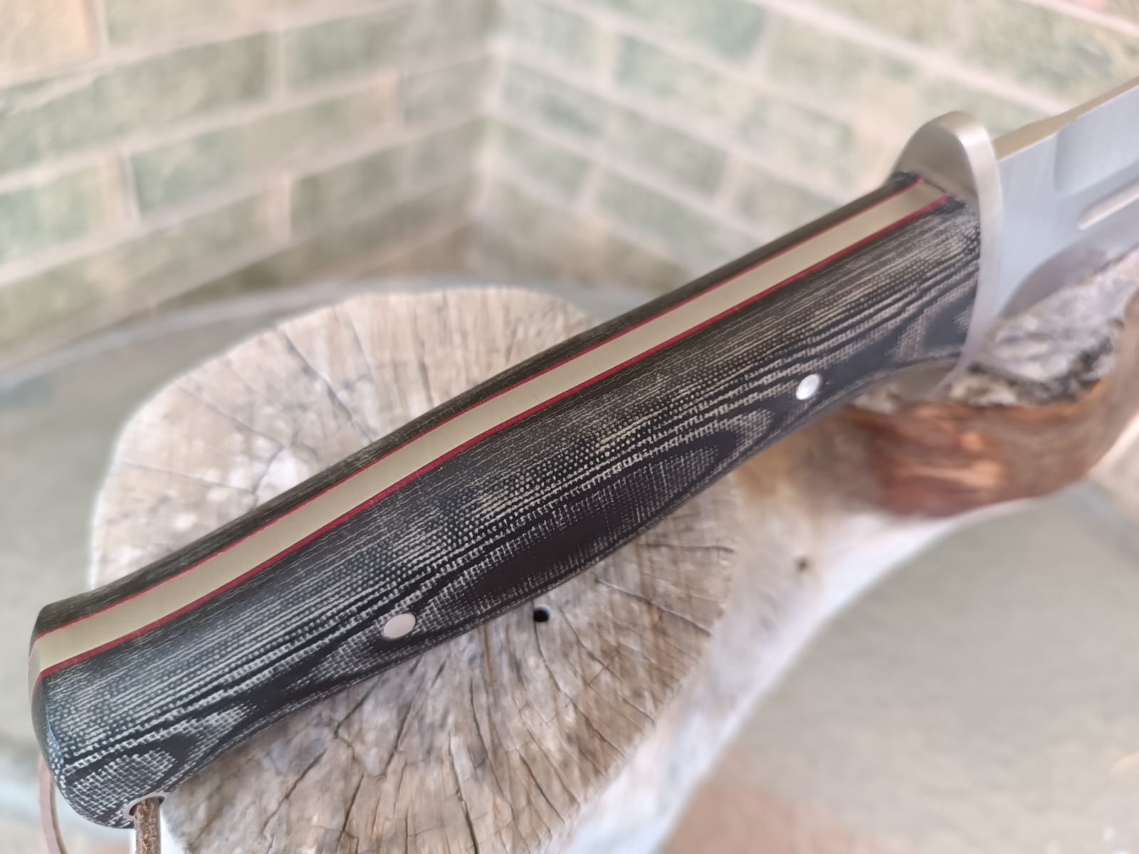 Hoja de acero inoxidable MoVa-58 de 218 mm. de largo. Espesor de hoja: 4,8 mm. Largo total: 372 mm. Empuñadura: micarta. Peso: 505 grs. Funda: cuero.
