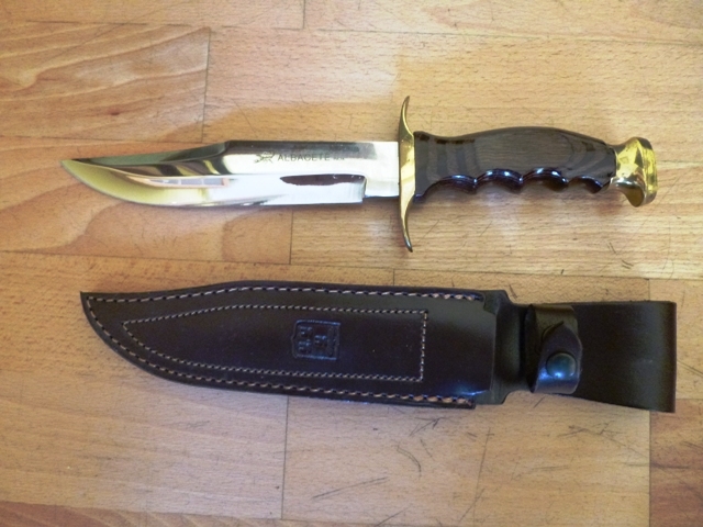 Bowie. Nuevo. Mango de madera y funda de cuero.