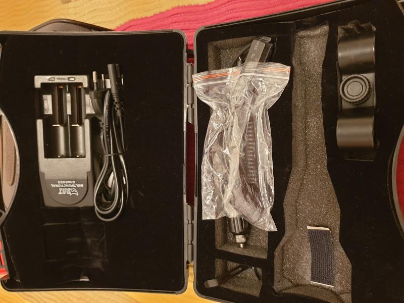 Lleva todos sus accesorios originales, cargador baterias, cargador para conectar a vehículo, acople para visor, cable pulsador remoto (dos), así como igualmente lleva un juego de baterias aún sin estrenar, en su embalaje original sin abrir.