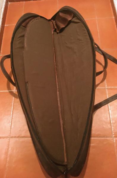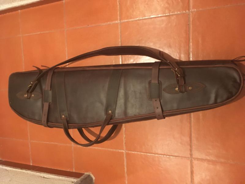 Se vende funda de piel para llevar dos armas, escopetas, rifle con visor etc. Solamente una cremallera y separador central, de 115 cm, con dos correas de sujeción, asas y correa de transporte. No ha pisado el monte, sólo ha salido dos veces al campo de tiro. Marcas propias de la