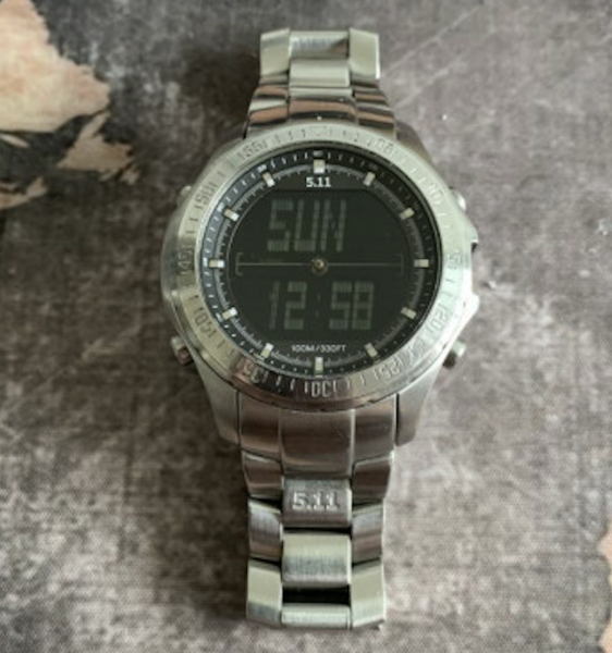 Reloj táctico H.R.T. en acero inoxidable de 5.11. Con calculadora balística Sureshot para calcular el punto de impacto de una bala (resultados en MILS, TMOA o SMOA).