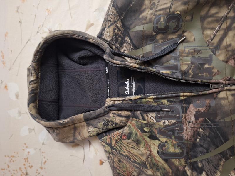 Vendo esta chaqueta tipo sudadera con capucha, el interior es de borreguillo y está nueva, solo puesta un día. Es de camuflaje Mossy oak y de la marca americana CABELAS.