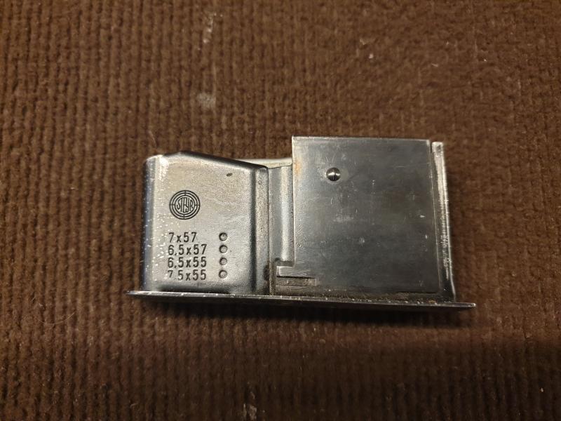 Vendo cargador metalico para rifle Steyr Manlincher en calibres 7x57, 6,5x57, 6,5x55, 7,5x55, el canto es plateado y labrado con motivos florales y la cabeza de un corzo. 120 € más portes.