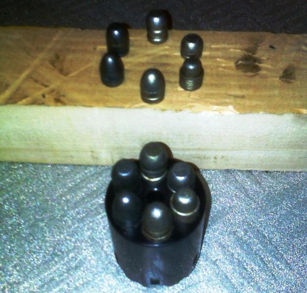 Pongo foto del tambor con seis modelos de bala del 45 (recalibradas a .451") posicionadas en él. Las balas en cuestión son: