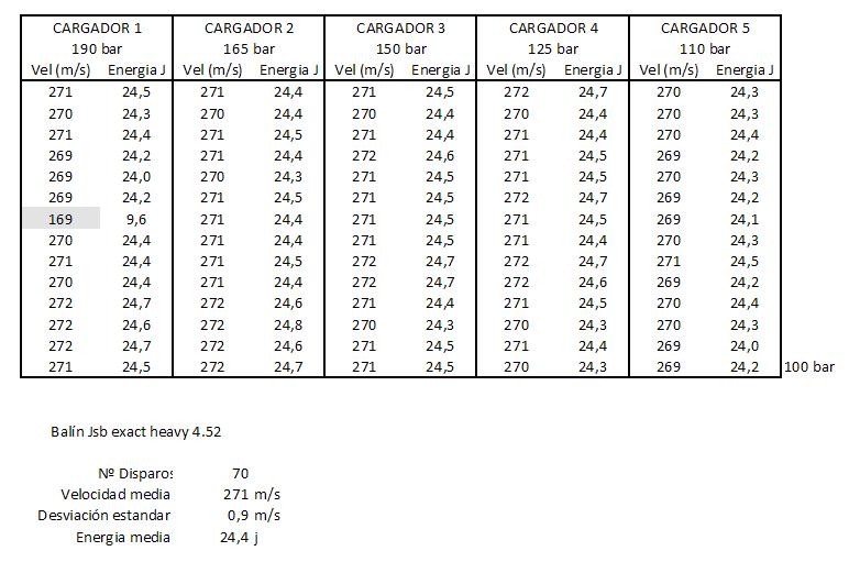 Deciros que en esa crono le saqué 70 disparos, pero que partiendo desde los 200bar y apurando hasta los 80 bares se le sacan 7 cargadores perfectamente constantes (98 disparos).
