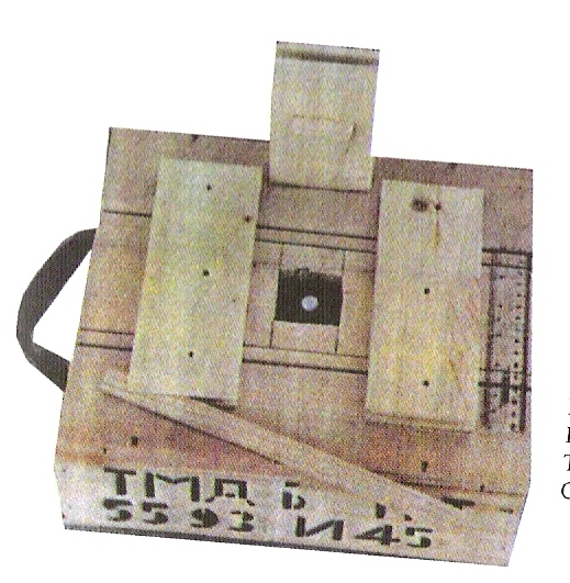 ExactoMina soviética TMD-B.Usada en la URSS, Vietnam, Líbano...y como no, Yugoslavia y Afganistan. Mide 32x28x16 cms y pesa cargada casi 10 kg. Tiene uso como anticarro y contrapersonal, de las tres tablillas de la parte superior, las de los extremos son fijas y la del centro se puede levantar gracias a una bisagra, esta tablilla tiene un resalte inferior que se encaja en el cuerpo de la caja sobre el percutor, sometida a una presión de 20 kg; si le ponemos el listón que se ve en las fotos, la presión se eleva a 135 kg pues trabamos el descenso de la tablilla hasta que se parte el listón, siendo así su uso contracarros.