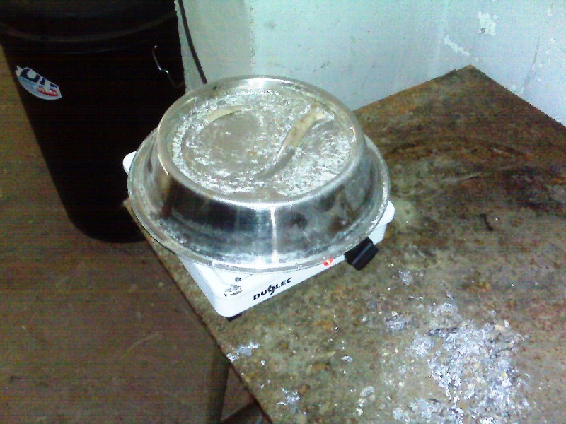 Estas navidades estuve "purificando" tuberías para tener plomo limpio y lo más puro posible para usar en avancarga y hacer mezclas con estaño y antimonio para otros usos. Las tuberías tienen un monton de impurezas pero al fundir salen todas a la superficie y con una espátula y un paleta de albañil, a dos manos se va limpiando. Para ese cometido en vez de fundir en el hornillo uso un infiernillo electrico de 1000V y un recipiente inox de comida para perros que por su forma permite a la vez concentrar el calor sobre la colada y es muy ancho por encima lo que permite manejar mucho plomo con comodidad. Despues, con un cucharon sopero robusto y unos moldes de aluminio para flanes me he hecho unos "lingotes" que caben muy bien en el hornillo Lee para producir balas, pesan aproximandamente 1'5kg cada uno. En total junte 72kg. Si os fijais bien, en las fotos se ve la escoria.
