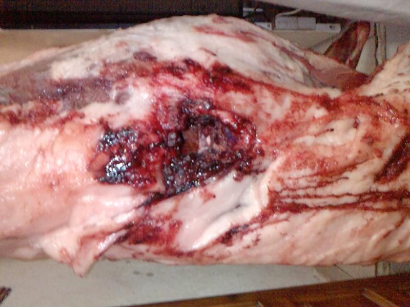 Es curioso que andase tanto con la cantidad de sangre que echó. El tiro entró por el comienzo del costilla en el lado izquierdo y salió por delante de la paleta derecha (en la foto se ve la salida) pero casi no expandió (la salida será de 1cm de diametro).