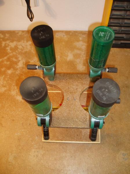Para los colegas que se han interesado por el soporte de los dosificadores les cuelgo un par de fotos haber si sirven de ayuda.Es una forma creo, bastante eficaz de tener los dosificadores a mano y sin ocupar mucho espacio. Cado uno de ellos con su tipo de polvora y medida para cada calibre, sin tener que ir vaciandolo y cambiando la medida a cada calibre que recargues.