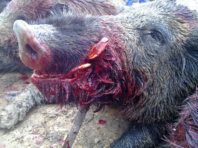 En la foto anterior el Hombre Grande que no cabía en sí de gozo, en esta la boquita del cerdo que rajó a un perro que le estaba ladrando a parado.
