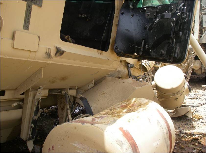 En lo referente a la explosion y el estado del MRAP. Yo no creo que fueron 500kilos, ni tampoco 250, que es lo que se comenta en diversas publicaciones, estas cantidades de explosivo, aunque se trate de material de baja velocidad de detonacion como el nitrato de amonio, harian desintegrar este vehiculo casi en moleculas en caso de producirse la explosion en cercania directa al MRAP, y si tenemos en cuenta que todos estos insurjentes ya utilizan hasta RDX para sus atentados, seria suficiente como para hundir un portaaviones con un poco de suerte. Asi a ojo y sin saber distancia exacta, pero suponiendo que se haya producido a 2-3m en diagonal hacia parte delantera del vehiculo, diria que son entre 35 y 45kg de explosivo equivalente a TNT. Por ejemplo RG-31 con 20kg de amatol bajo su chasis no lo podria aguantar de ningun modo, este Cougar es mas protegido pero no como para hablar de cientos de kilos, esto no lo soporta ningun carro blindado y media tonelada ya es demasiado incluso para muchos buques acorrazados.