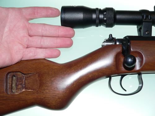En cuanto a la calidad... Bueno, no es una carabina hecha para la competición: su cañón no es flotado (de hecho al ser un K98 "jibarizado" lleva sus correspondientes argollas y maderas cubrecañón), sus miras abiertas son más que flojas y sus acabados corresponden a su precio, PEEEERO según creo el interior del cañón es cromado, el cerrojo es sencillo y efectivo y al igual que el gatillo se puede suavizar y a partir de los 300 tiros mejora bastante. Las piezas son de buen acero y pesa bastante.