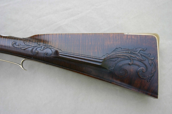 Con este hecho la culata parecía muy desnudo, sin un pedazo mejillas, y sin caja, por lo que un diseño con barras de plata por cada lado de la culata paralela a la placa de culata se tomó prestado de un rifle de Bucks County Pennsylvania que ha sido atribuida a John Shuler, que también tiene un gatillo desplaza similar a la que en este cazador.