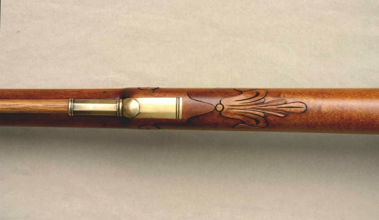 Jim es, obviamente, intrigado por la obra de George Schroyer y de alguna manera ha prestado su "Flor de Lis" diseños de tipo tanto detrás de la espiga y la entrada trasera. Esta es su última pieza, que se terminó días antes de la 2007 "Contemporary Longrifle Show", en Lexington, Kentucky. Esta pieza está basada en varios de los rifles Schroyer y un "recién llegado" rifle. comenta Jim, "quería mantener el rifle bastante conservador y no demasiado elaboradas. Traté de dar forma a la población a tener una arquitectura llamativa con talla fuerte que complementa muy bien. "Fue con mucho éxito con su esfuerzo artístico y el rifle fue rápidamente arrebatada por uno de los coleccionistas de armas de fuego de primera contemporáneo, el Dr. Barry Maxfield. El cañón es de los hermanos Rice - calibre .54, 44 pulgadas de largo. El bloqueo es una Ketland Cámaras temprana que ha sido alterado, cementado y templado así. El touchhole no está alineado, sino más bien directa perforados y conificado internos, que prevé un encendido tradicional con todo muy rápido y fiable. El stock has13 5 / 8 "pulgadas de tirar y se forma desde muy dura y densa de azúcar de arce aserrada trimestre de valores de Dick Miller. Se terminó en primer lugar utilizando raspadores y teñidas con agua fuerte. Todos los componentes excepto el barril, seguridad y los tornillos son hechos a mano.