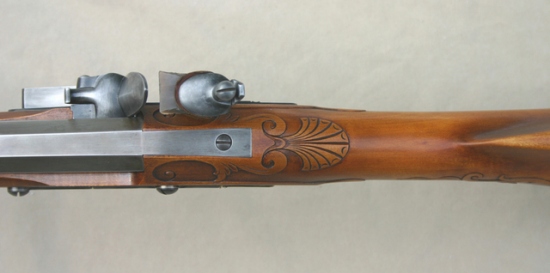 Diseño de este rifle se inscribe en la mayoría de lo que consideraría la "Escuela Nueva" de estilo. Muchos de los elementos talla son muy similares a las que a veces usada por Juan Bivins y se inspiraron de hecho, por su trabajo. Jim tiene reservas acerca de esta pieza ya que no se inspiró en su totalidad por las escuelas existentes de gunmaking, sin embargo, siento que este fusil es algo así como un arreglo moderno del Mesías de Haendel, interpretado en un piano en lugar de un clavicordio. Es simplemente fantástico, pero no realmente cualquier cosa como cualquier rifle original que jamás encontrará. Creo que era de hecho Jim Kibler - estirando sus alas - saltando fuera del nido, no por primera vez, pero después de un par de vuelos de prueba ... pero luego decidió que esto era divertido y se dijo, hey ... permite probar un par de "bucle de" loops "y luego tal vez un back flip invertida! Whoopee! Y lo hizo BUENO! Sí, incluso felicitar a mi buen amigo John Bivins de trabajo, que le había prestado también de motivos de otro día. La talla de esta pieza es magistral. Fluye muy bien de la pieza de la mejilla, a la espiga y continuando hasta la entrada posterior dedal. Es muy bien ejecutado y de buen gusto. Para quienes están familiarizados con el trabajo de la tarde Bivins Juan, este fusil se pondrán de inmediato a pensar en notable talento de Juan y los diseños, pero Jim no ha copiado el trabajo Bivins ', sino más bien construida sobre ella y la labor de los maestros de antaño. Juan simplemente les encantará este rifle ... y yo también