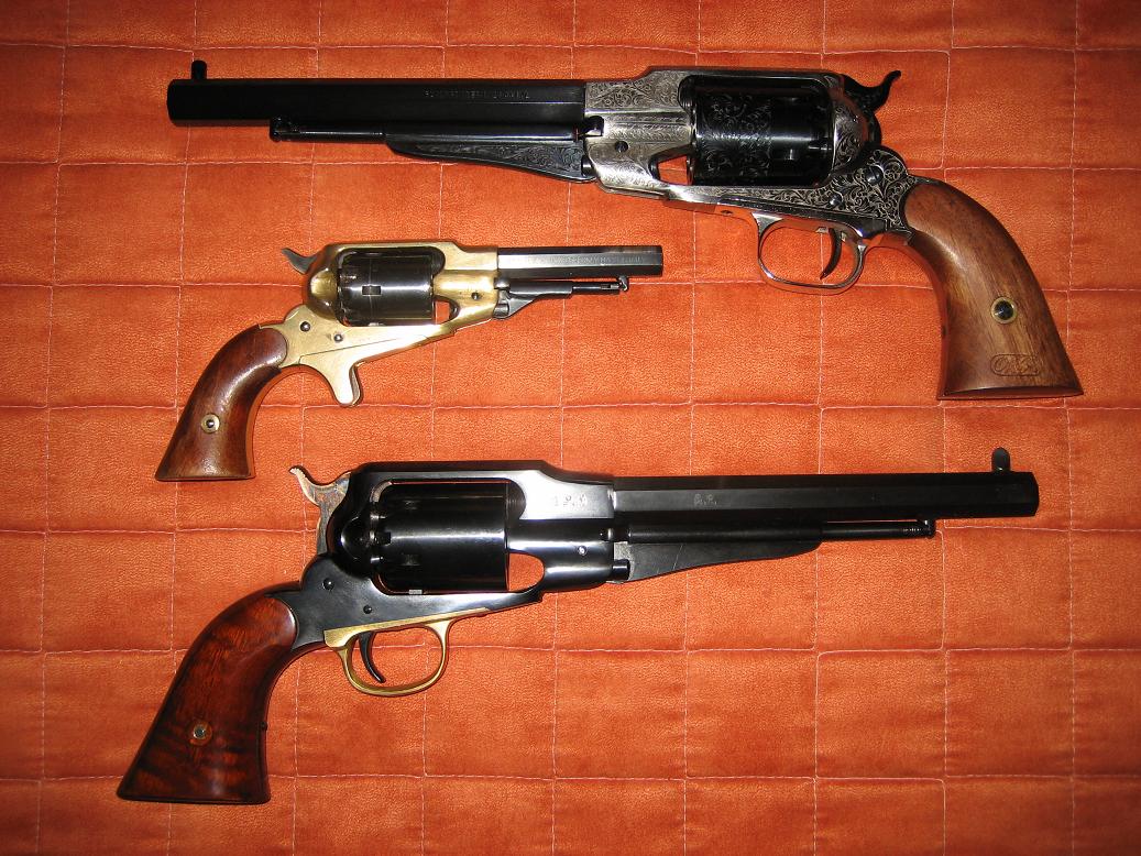 Remington New Model Army del .44 grabado de Pietta, Remington Pocket en .31 de Armi San Marco, y Remington New Model Army del .44 de Uberti