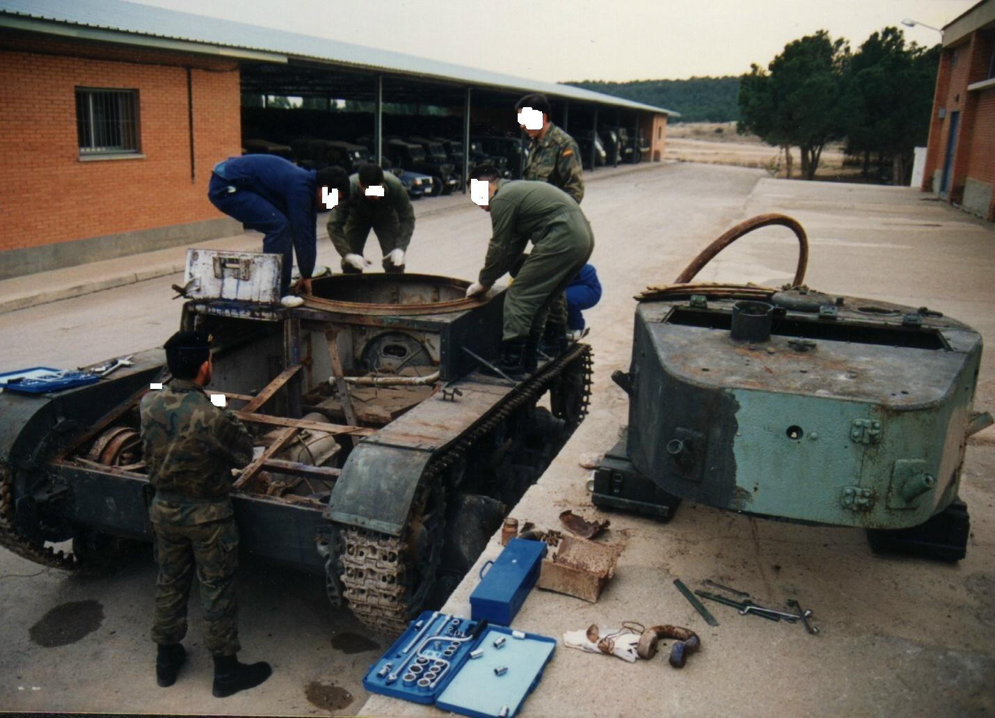 unas fotillos de un T26 que fue restaurado por miembros del RCLAC Numancia nº 9, alla por 1995...y que actualmente se encuentra en un jardin, a la intemperie y sufriendo el "acoso" de los aspersores...y este carro se restauro en condiciones de marcha, pudiendo incluso disparar....cosas que pasan...