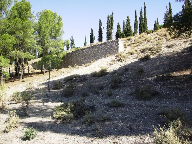 este muro que ahora sirve de contención para las tierras de la plataforma del monumento era un parapeto circular construido con los escombros del antiguo monumento que quedaron tras la voladura del mismo por los rojos.