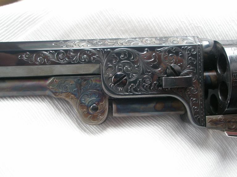 Os presento un Colt Navy 1851 2ª generación de los pocos que se hicieron grabados en esta reedición de la Casa Colt. El estilo del grabado es el de Nimschke que en los años 1850-1870, aproximadamente, trabajó para Colt, Winchester y otros.