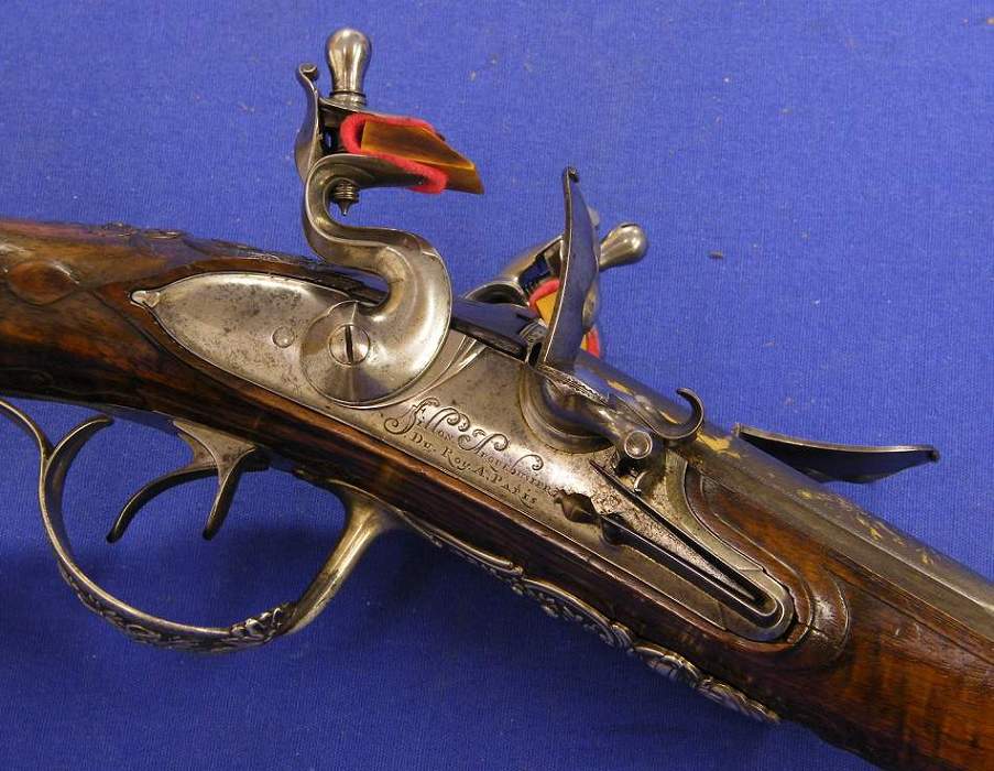 A very nice 18th century French Flintlockgun with silver mounts, signed by Fillon Arquebusier de Roy a Paris, in mint condition.