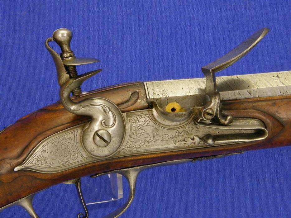 Un bello fusil austriaco de llave de silex por FELIX MEIER de Viena con aparejos de plata y cañon turco, sobre 1720 en calibre de 16 mm. y una envergadura de 145 cm.