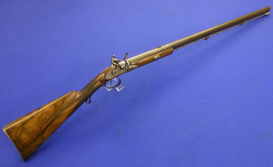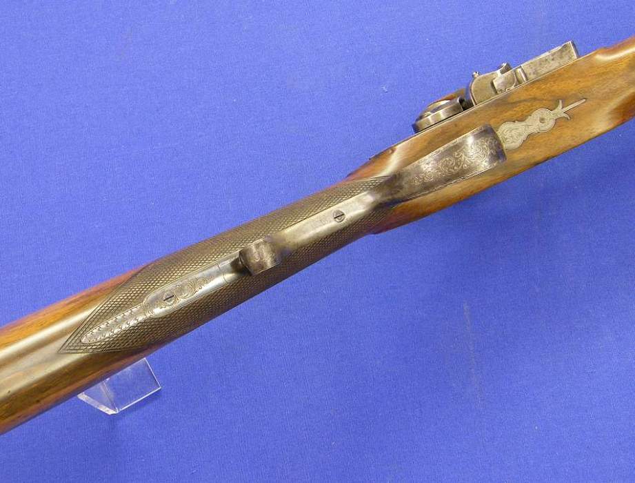 Rarisimo rifle ingles del siglo XIX con llave de silex y de percusion combinadas y cañon para "bolas ceñidas" (¿?), firmado por John Blanck de London, en perfectas condiciones.