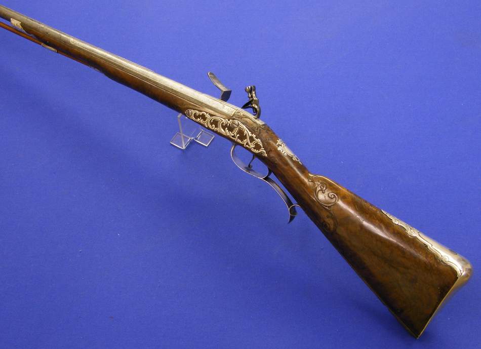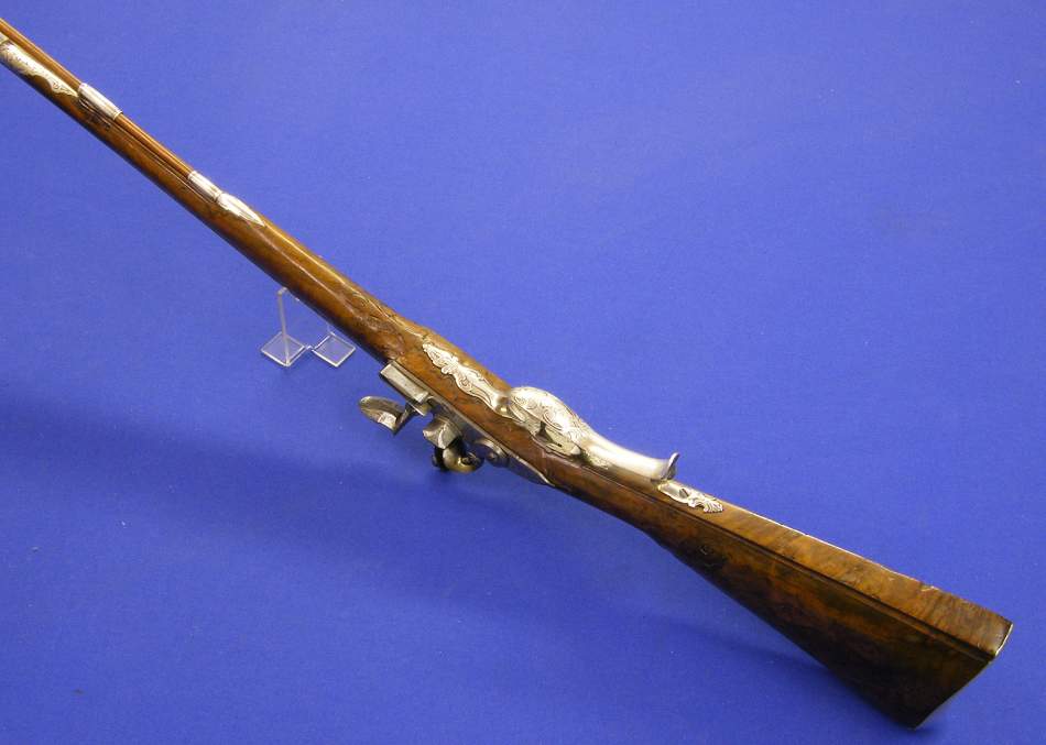 A very nice Austrian Flintlock Gun by FELIX MEIER IN WIENN, with silver mounts and a Turkisch barrel, circa 1720, cal 16 mm, length 145 cm, in mint condition