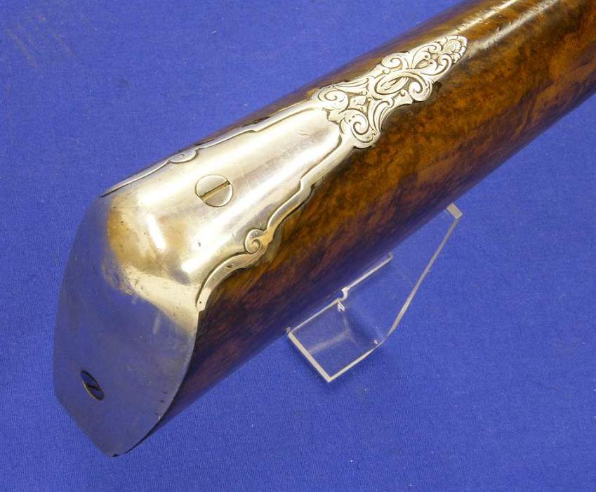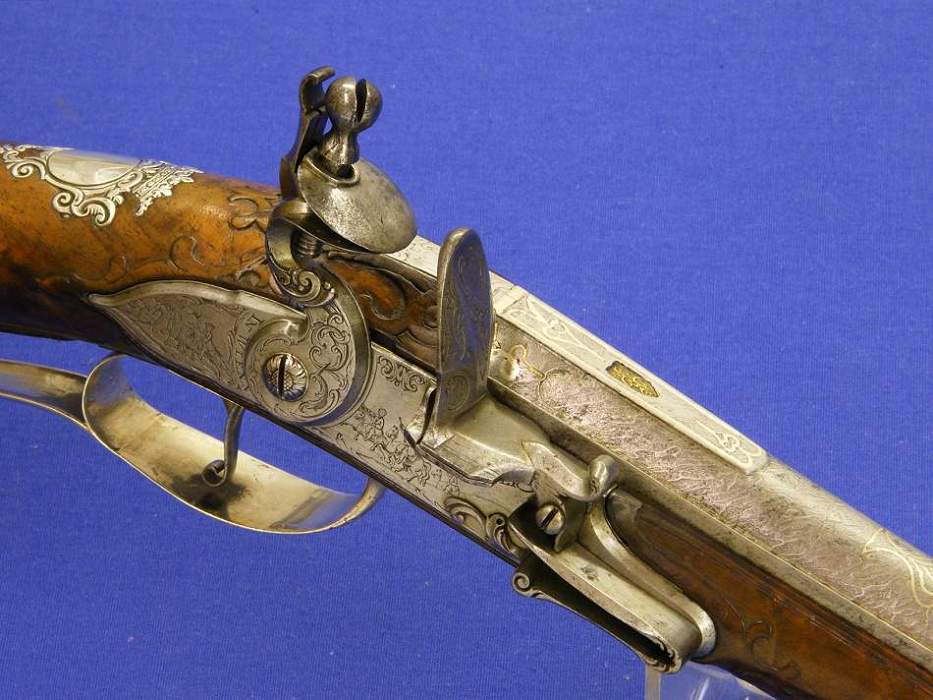 The gun has a very nice in silver decorated Turkish Damast barrel with a goldmark. The lock is very nice engraved with battle scenes.