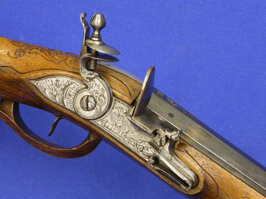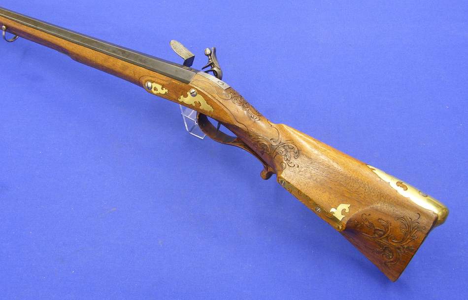 Un precioso rifle de chispa de principios del siglo XVIII, firmado por Andreas Gans en Augspurg, en calibre de 15 mm, y una envergadura de 126 cm. En ideal situacion.
