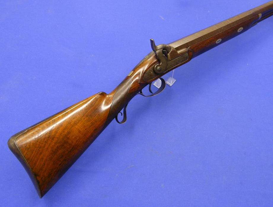 Este deportivo y muy pesado fusil ingles de anima lisa tiene el calibre de 19 mm. y un largo de 150 cm. en perfectas condiciones. Tiene en el cañon, parte superior, la incripcion London y en la parte inferior, las marcas del banco de pruebas de Birmingham, I.W. y tambien TWISTED.