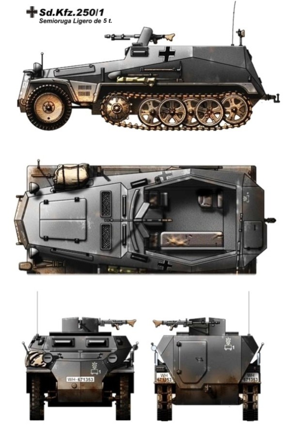 1.- Sd Kfz 250/1. Vehículo diseñado para el transporte de una escuadra de fusileros y equipado (según variante) con 1 ó 2 ametralladoras MG34.