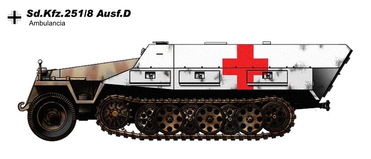 14.- Sd.Kfz 251-8 Ausf D ambulancia. Este vehículo por su versatilidad permitía la adaptación de una variante de sanidad con capacidad para dos heridos tumbados y un amplio kip de curas y 1º, auxilios