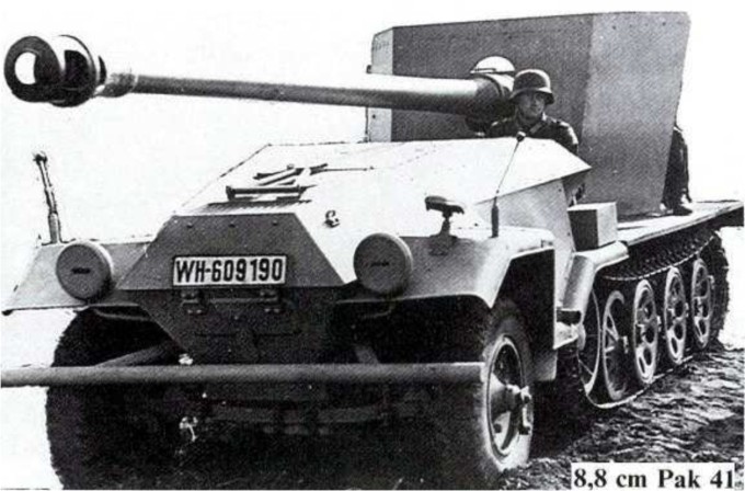 25.- Sd.Kfz 251 Pak 41 con cañón de 88 mm. Entre otras pruebas y experimentos que se desarrollaron sobre este magnifico vehículo fue la instalación del potente cañón antiaéreo / contra carro de 88 mm en su variante terrestre Pak 41. Como siempre, se desarrollaron muy pocos ejemplares, puesto que su potencia de retroceso, hacía peligrar el sistema de suspensión del vehículo.