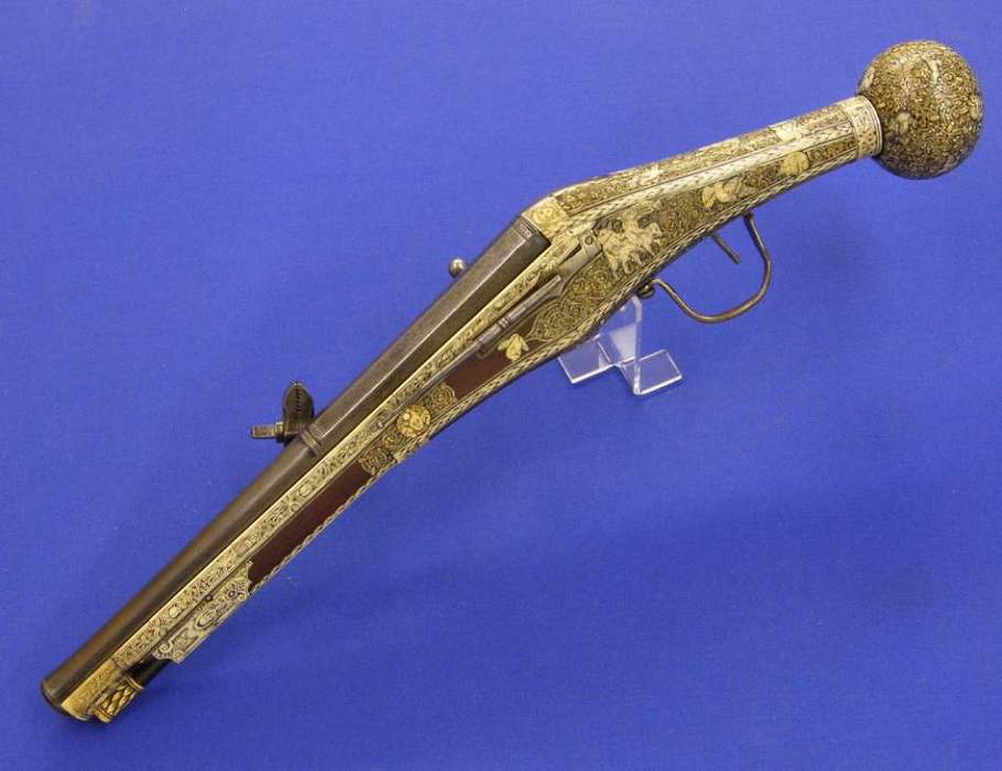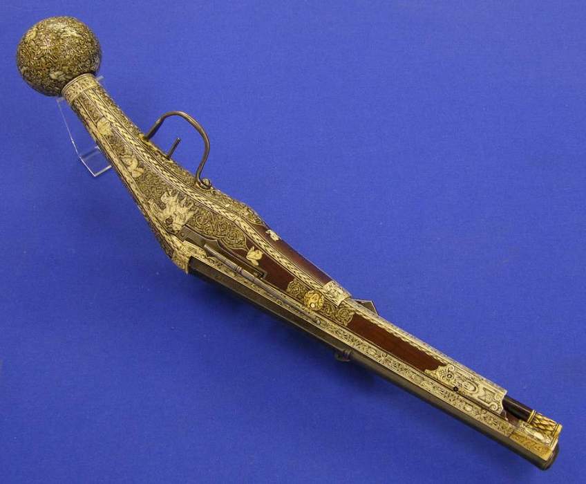 Preciosa pistola alemana de llave de rueda datada en 1587, largo de 55 cm. In ideal estado. Procedente de la colección Visser y vendida en Sotheby's London el 3 de julio de 1990 (lote 192)