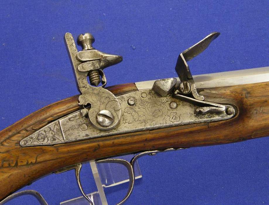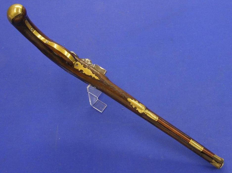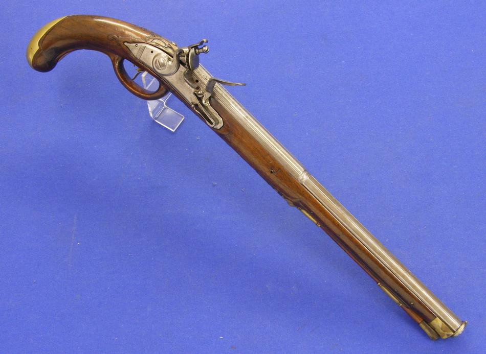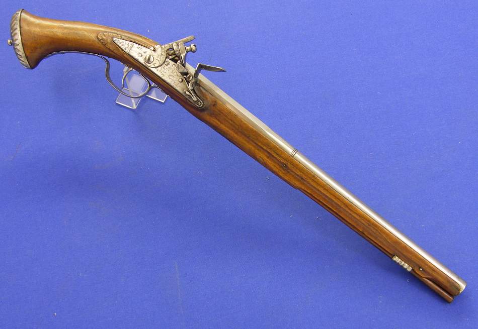 Pistola alemana de chispa del siglo XVIII con cañon italiano por Antonio Francesco, calibre 14 mm. longitud 50 cm, en estado ideal.