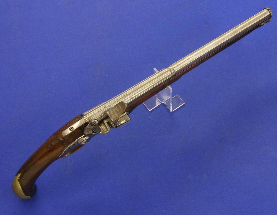 Bonita pistola de silex multi-disparo con sistema Lorenzoni por H.W.MORTIMER LONDON, sobre 1800, calibre 12 mm. longitud 44 cm. en condicion ideal.
