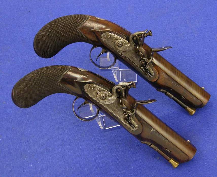 Muy bonita pareja de pistolas alemanas de percusion de doble cañon por I.Adam Kuchenreuter en Regensburg, calibre 12 mm, longitud 34 cm, en condicion ideal.