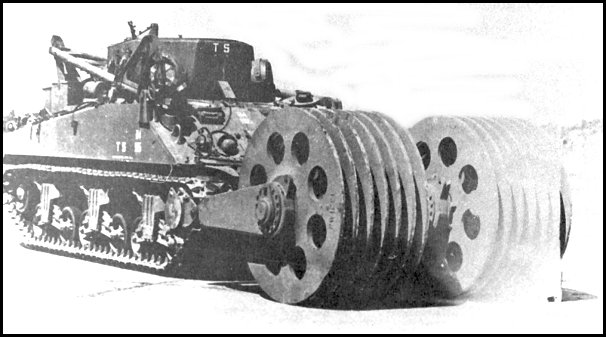 31.-CCM M4 Sherman con sist. antiminas T1E1. Para este sistema se utilizaron carros Sherman recovery que llevaban instalado en el glacis del casco un mortero de 81 mm.