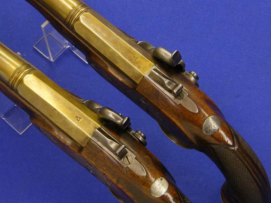 A very nice pair of French Officer Percussion Pistols by BLANCHARD, caliber 18 mm, length 39 cm, in mint condition