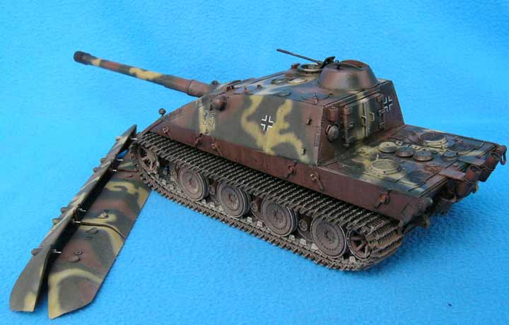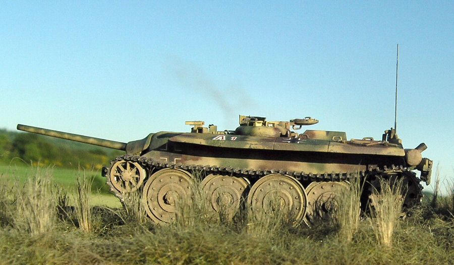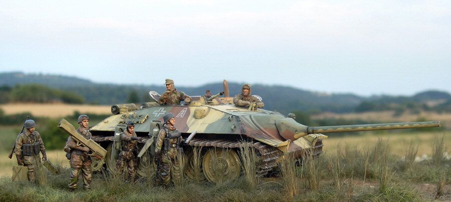 No siempre los alemanes salen victoriosos, como atestigua este E25 Jaguar II de una unidad de apoyo. Los soldados de acompañamiento portan algún tipo experimental de panzerschrek