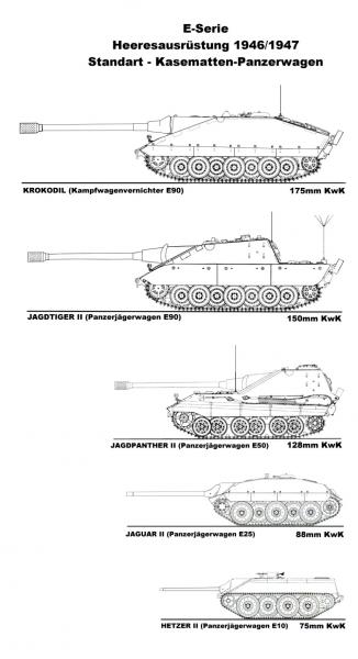 Diagrama de los Kasematten, desde el más ligero E10 Hetzer II hasta el Krokodil con cañón de 175mm.