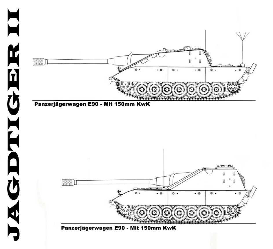 Dos versiones del E90 Jagdtiger II, con torreta adelantada o atrasada. Cañón de 150mm