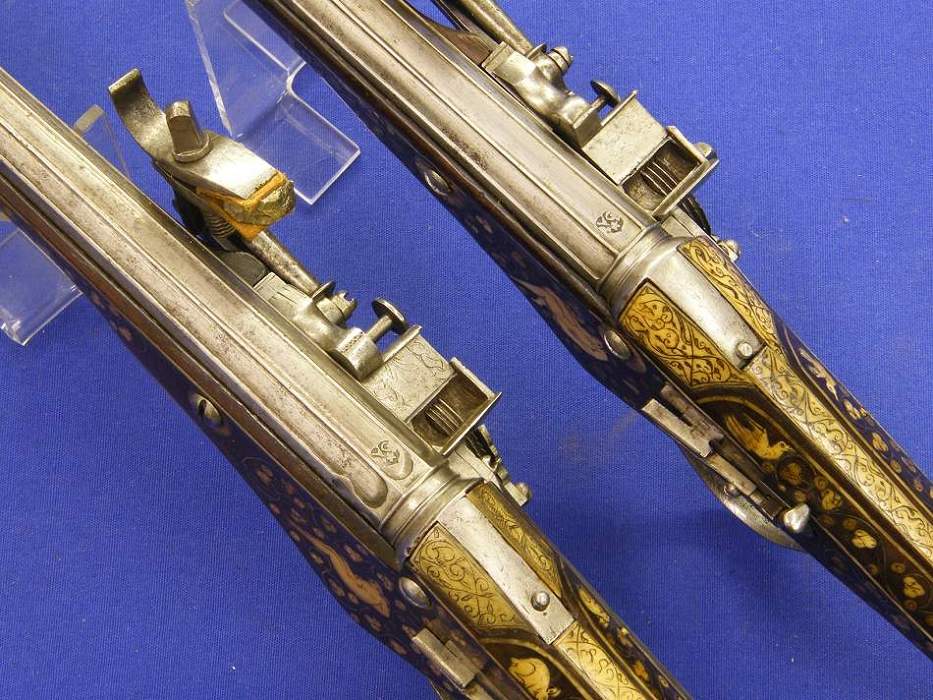 Menuda pareja de pistolas de chispa alemanas de doble cañon, bastante pesadas por Johann Bosselman (Elberfeld Westfalen Germany) cerca de 1690, (a los alemanes, por lo visto, les encantan las armas de multiples cañones desde siempre) longitud 51 cms (cada una) en muy buen estado.