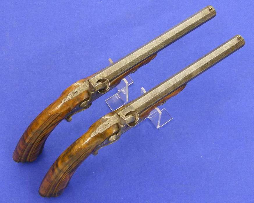 The pistols have fine damast barrels, caliber 13 mm. Length of the pistols 37 cm.