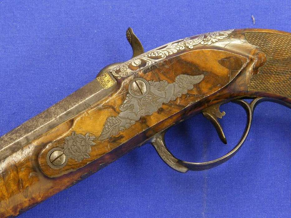 A very attractive Italian perkussion pistol with silver inlays and gold decorations, burr walnut stock, signed lock Ferd. Minelli, barrel Brescia, length 31 cm, in mint condition