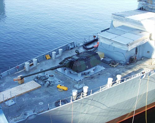 Esto no es un what if ni un fotomontaje, pero podría pasar por alguno de ellos: torre de Pzh 2000 instalada en un buque de guerra para pruebas. El montaje se denomina MONARC y se probó en 2003 logrando un alcance de 41 km.