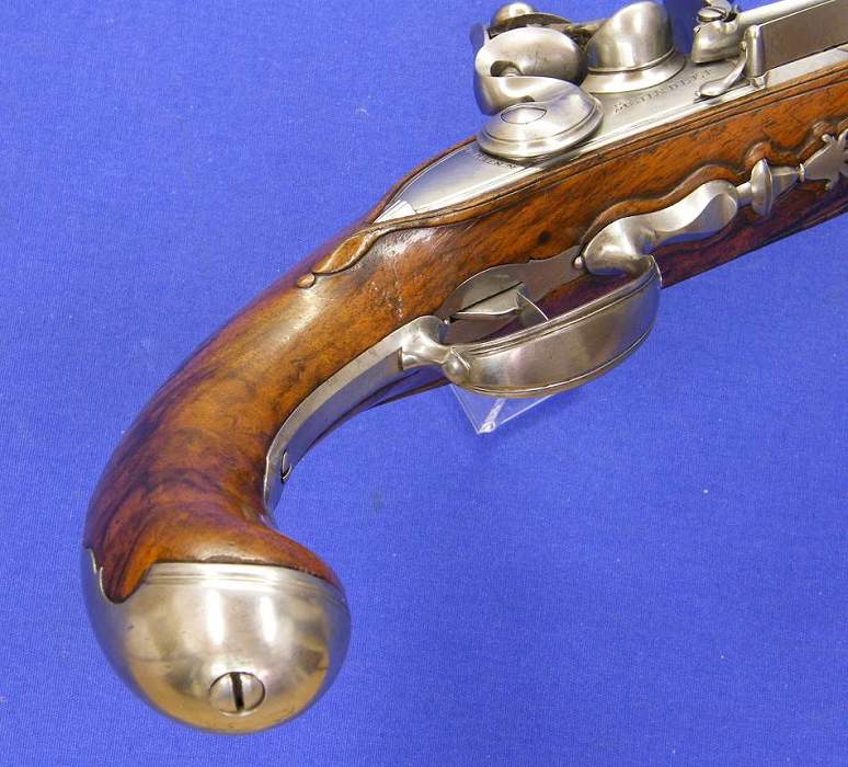Preciosa pistola inglesa de silex por W. Hollis de Birmingham sobre el año 1800, calibre 17 mm, longitud 39 cm. En perfecto estado.