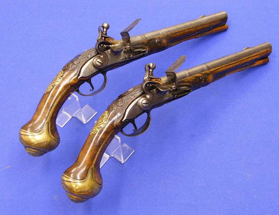 Bella pareja de pistolas holandesas de silex por Penterman de Utrecht, sobre 1720, longitud de 42 cm. Calibre 16 mm. En muy buen estado,